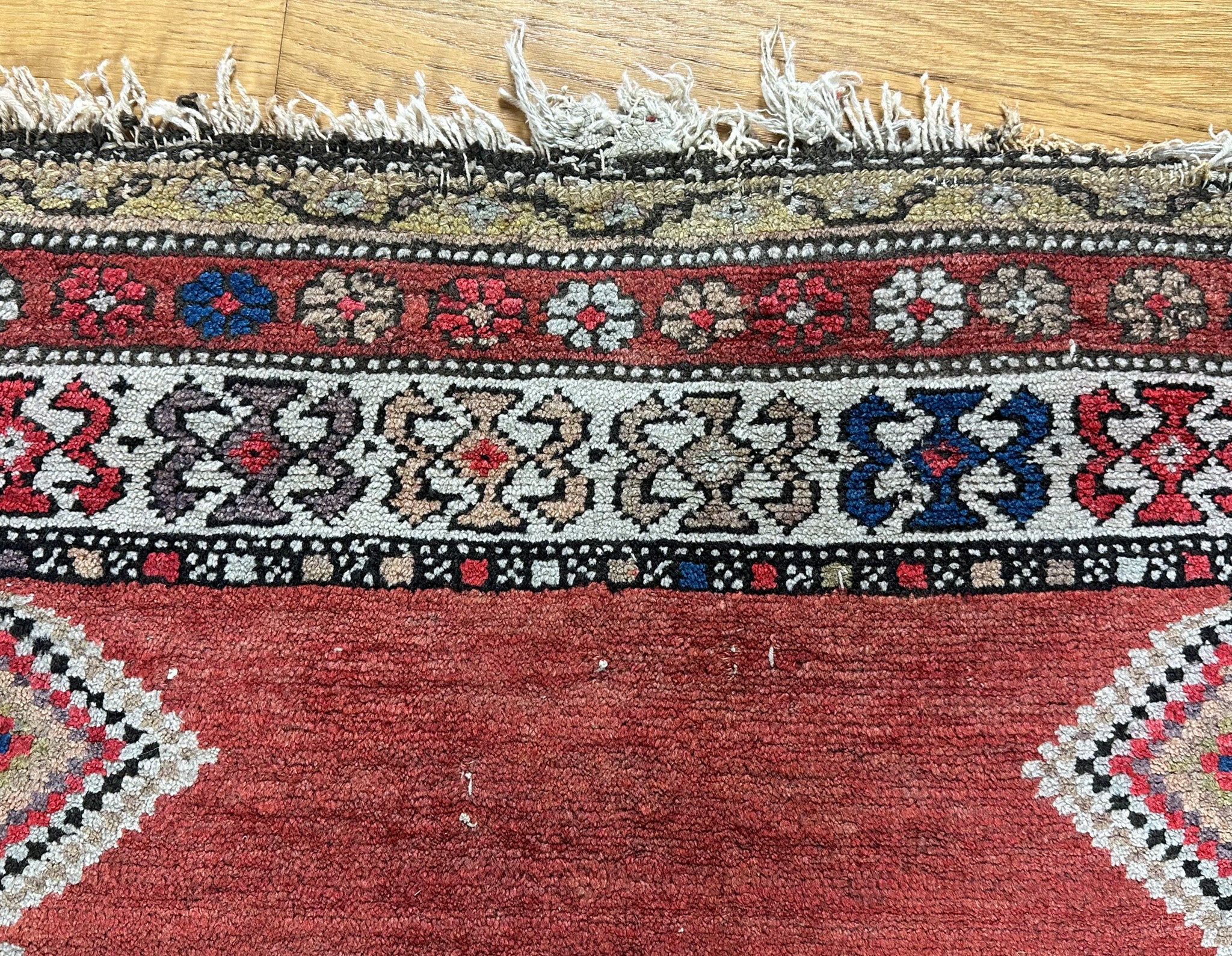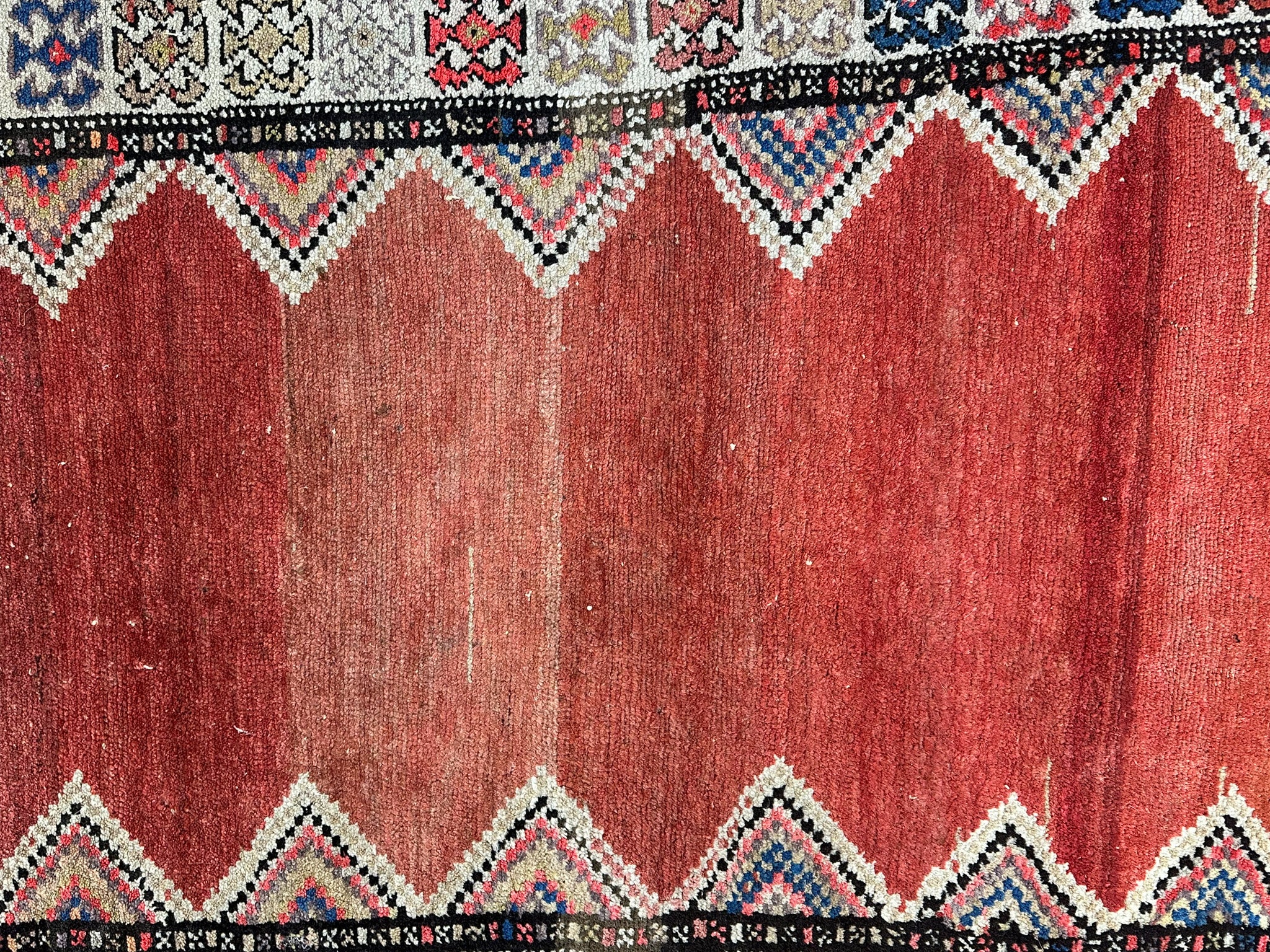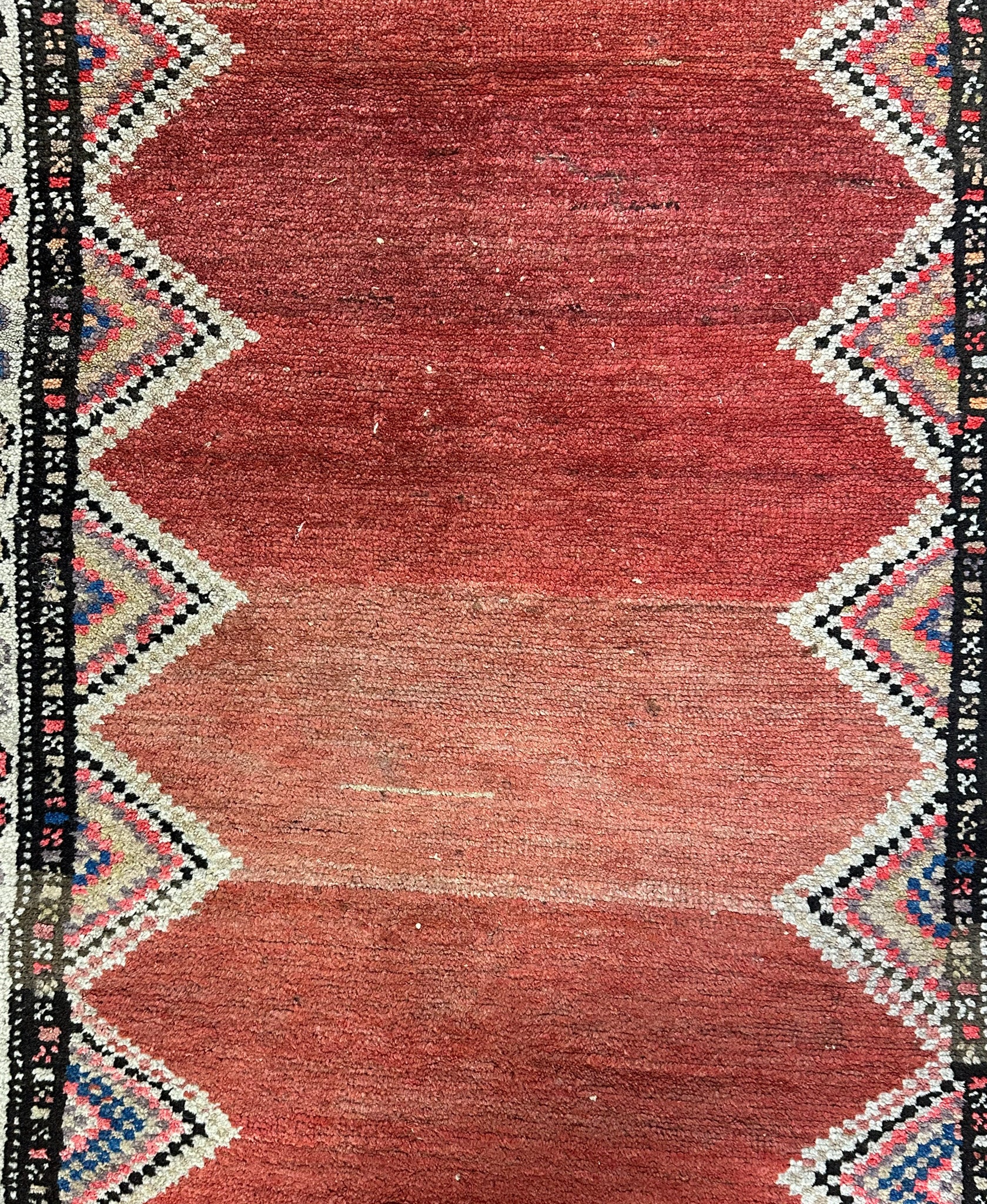 Plain terracotta field with half diamond-shape medallions extending out of the field on the sides. Ivory medallion main border, terracotta and pale yellow floral guards.
