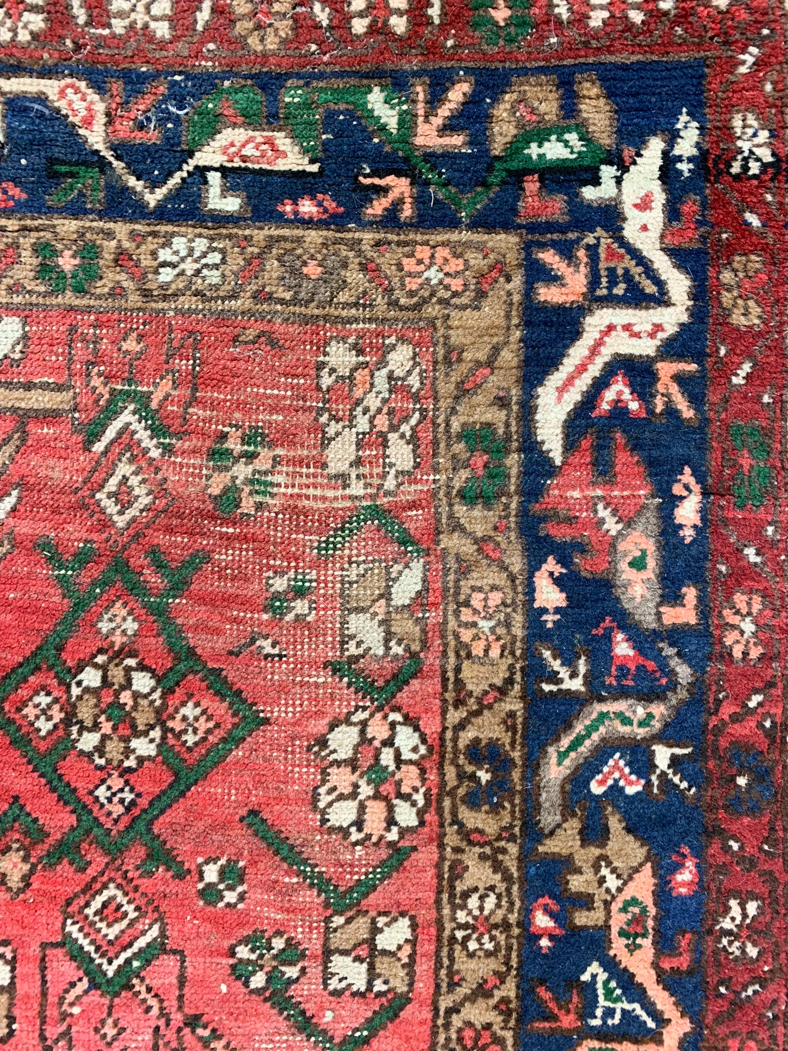 Red field with dark blue central medallion; all over stylised herati design; dark blue angular floral and birds in main border; red and camel guards. Dark green accents.